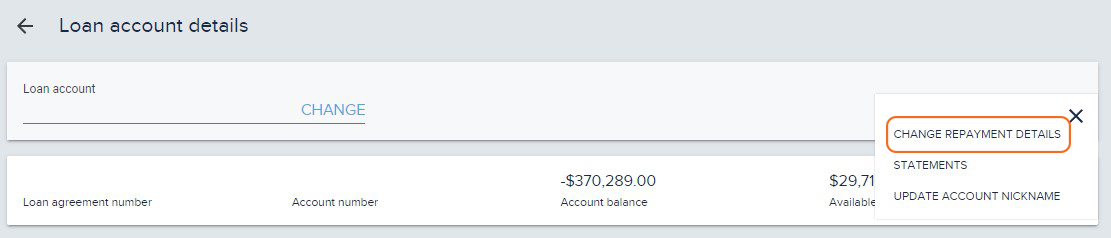 - On the ‘Loan account details’ page, select ‘More actions’ (c) and then ‘Change repayment details’.